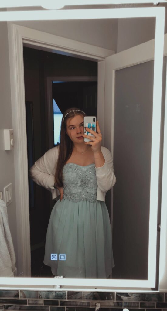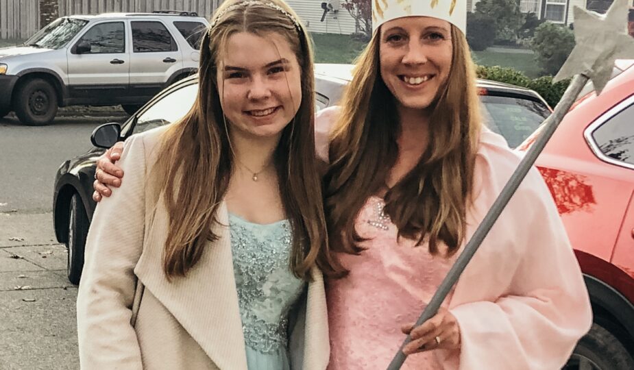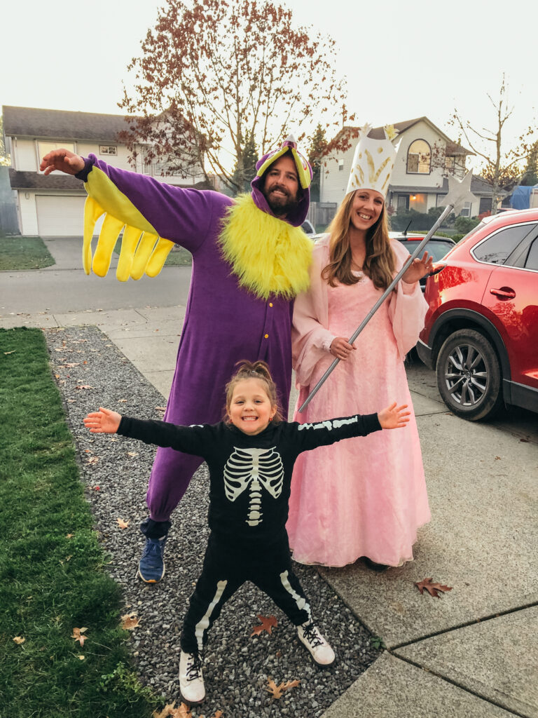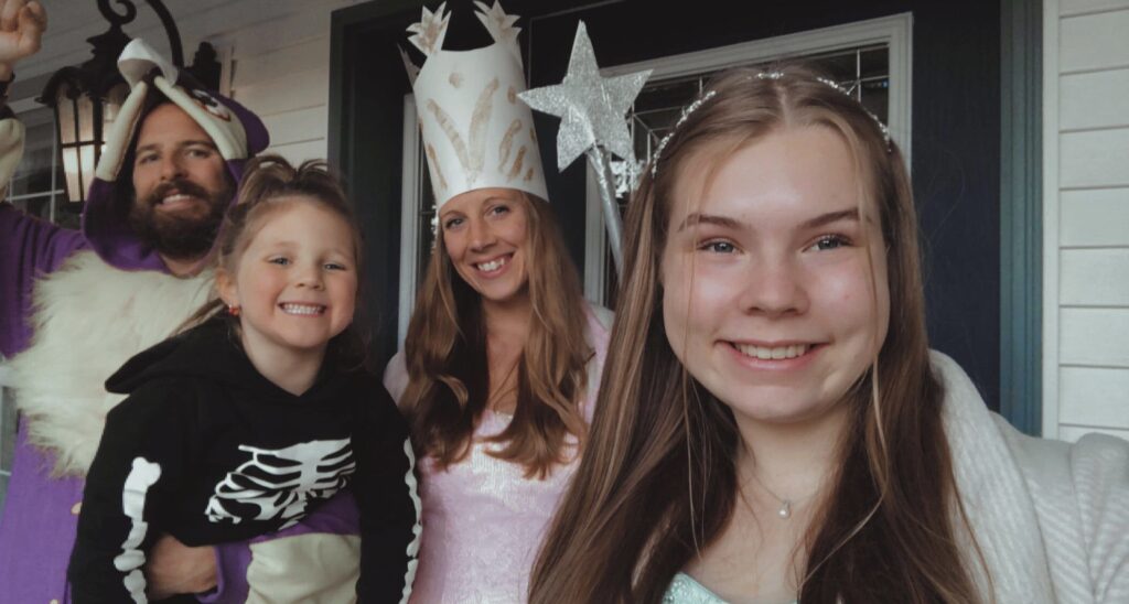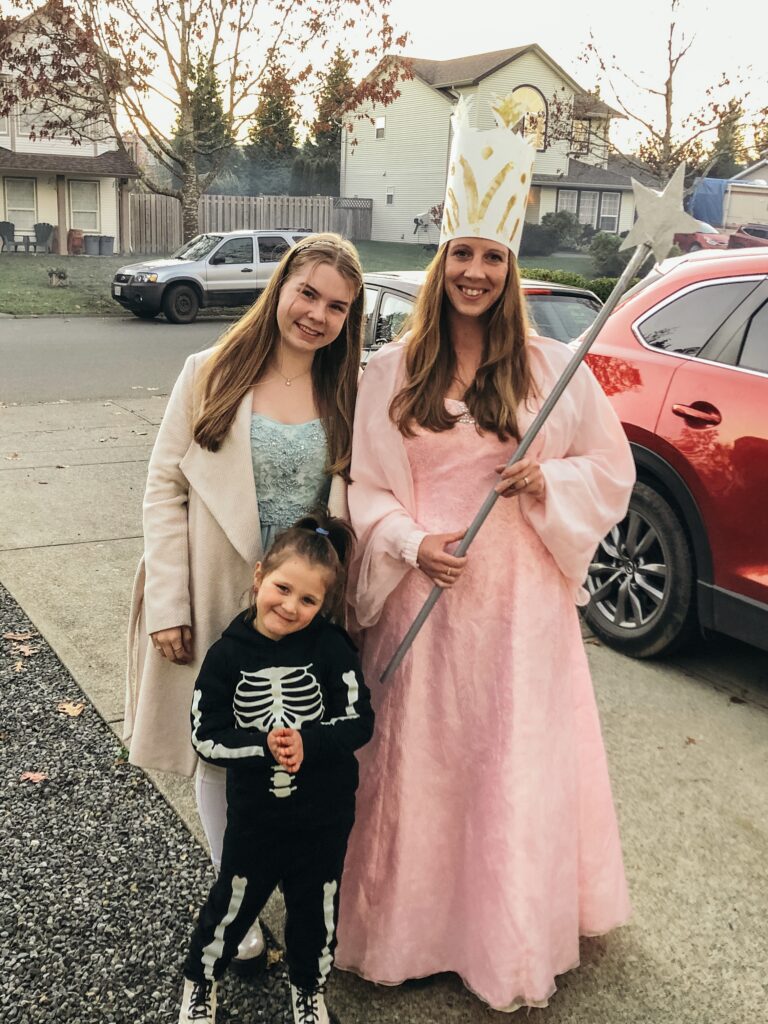 Hier seht ihr übrigens nochmal unsere Kostüme: Carolyn als Skelett, Elizabeth als die gute Hexe Glinda von der Zauberer von Oz, mein Gastvater als lila Eule und ich als Eisprinzessin.
