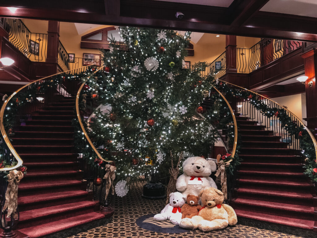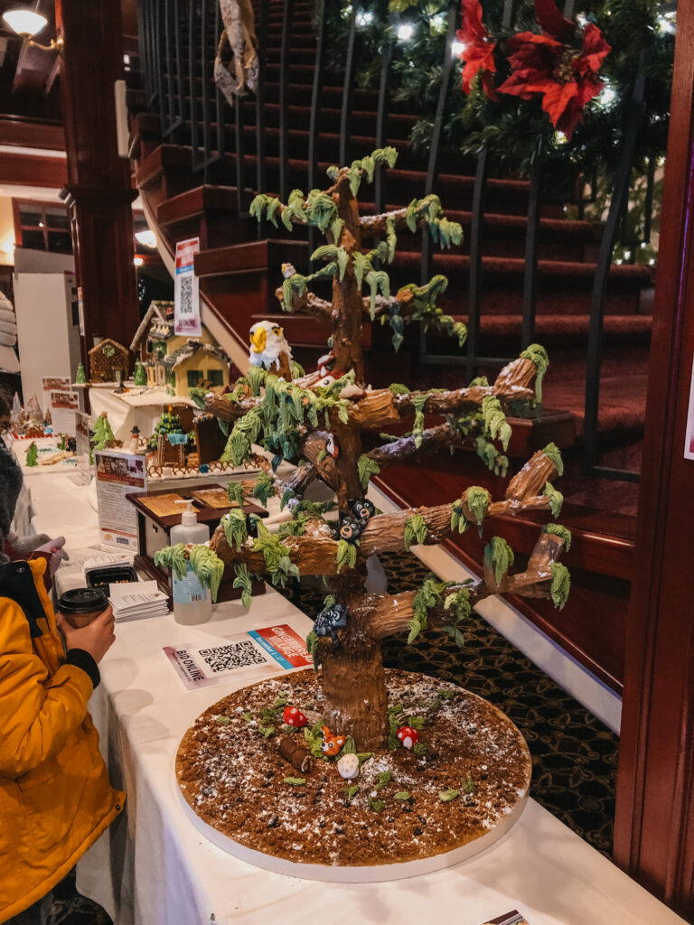 Zuletzt gingen wir noch in den Eingangsbereich des Hotels hinein, denn dort waren einige Lebkuchenhäuser aufgebaut, bei denen man auch nochmal für seinen persönlichen Favoriten abstimmen konnte. Außerdem hatte man die Möglichkeit den riesigen Weihnachtsbaum in der Mitte des Raumes zu bewundern, den ihr hier im Bild sehen könnt. Nachdem wir dann also für unser Lieblings-Lebkuchenhaus gevotet hatten, ging es wieder nach Hause.