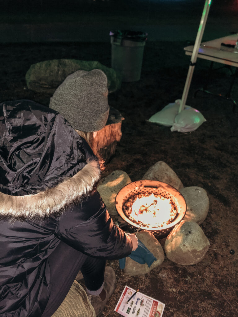 Die freundlichen Mitarbeiter*innen des Resorts händigten uns als kleine Zwischenmahlzeit kleine Tüten mit je zwei Marshmallows, zwei Butterkeksen und einem Stück Schokolade aus, womit wir daraufhin über zwei Feuerschalen S’Mores machten (für alle, die den Snack noch nie probiert haben, es ist sehr empfehlenswert, besonders wenn die Marshmallows über dem Feuer schön karamellisiert und im besten Fall nicht abgebrannt sind).