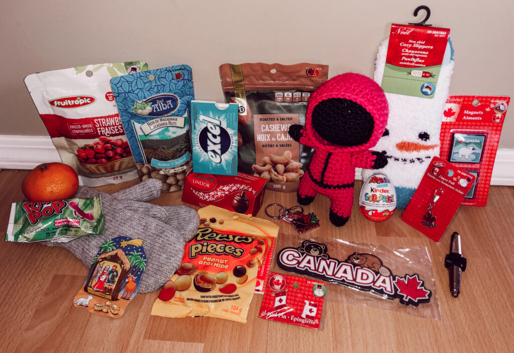 Wie ihr unschwer erkennen könnt, erhielt ich neben Lebensmitteln einige alberne Gegenstände, wie etwa die Socken, die Kanada Souvenirs oder die von meiner Gastmutter selbst gehäkelte Puppe einer sehr bekannten Netflix Serie.