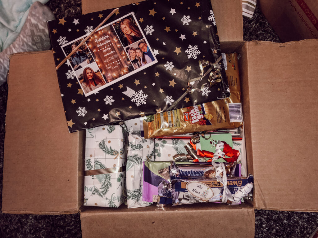 Für meinen Gasteltern hatte ich ein Puzzle mit drei Bildern von uns bestellt, sowie drei kleine Schälchen und Schokolade gekauft. Die Schokolade schmolz ich und verzierte sie mit weiteren Leckereien. Meine Gastschwester Carolyn bekam ein Malbuch, Überraschungseier und eine Kinder Badekugel, meiner älteren Gastschwester Peyton schenkte ich eine Box voll mit nützlichen Kosmetikartikeln und Snacks in ihrer Lieblingsfarbe blau.