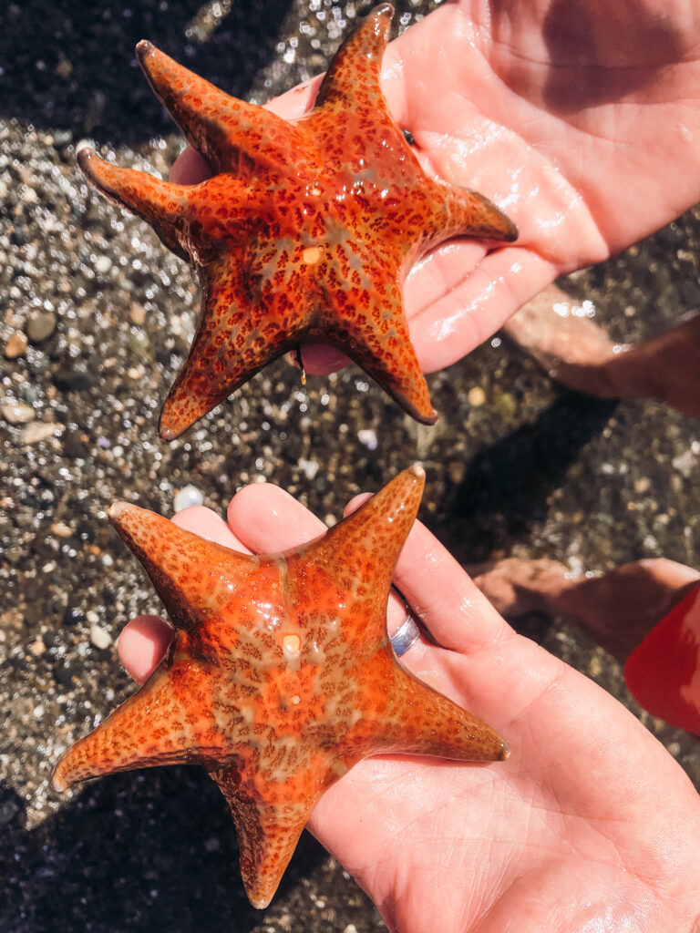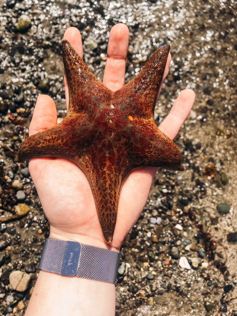 Wir zogen unsere Boards alle ans Ufer und liefen etwas den Strand entlang, in der Hoffnung Seesterne oder schöne Muscheln zu finden. Und siehe da, hier sind sie, im zweiten Bild sogar ein Seestern mit sechs Zacken: