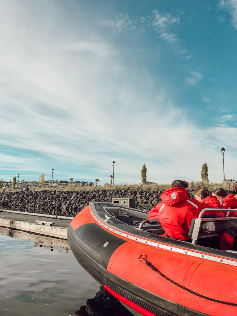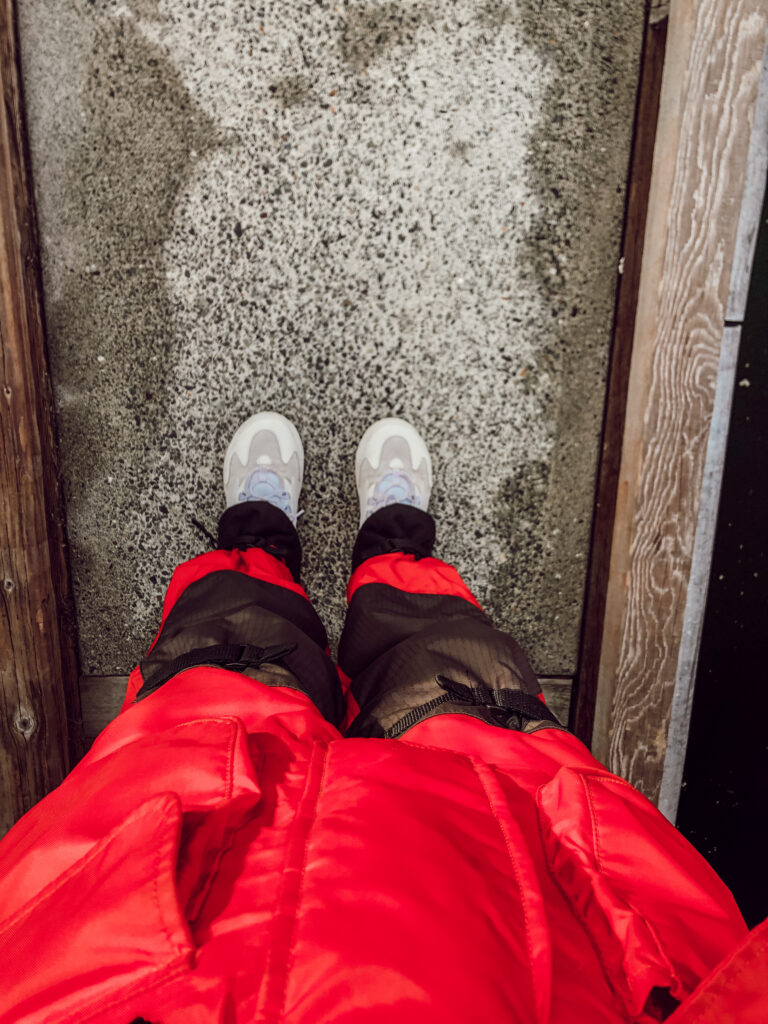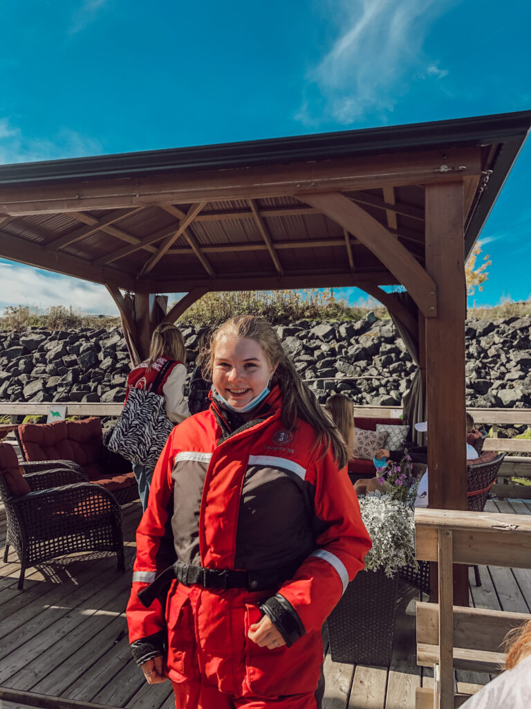 Glücklicherweise spielte auch das Wetter mit, doch trotz Sonnenschein und ca. 18 Grad Celsius bekamen wir von den Tour Guides einen dicken Ganzkörperanzug, der uns auch vor dem Wind und Wasser auf dem Boot später schützen sollte. Wir sahen wirklich alle aus wie Leute von der Feuerwehr, denn die Anzüge hatten eine knallrote Farbe, wirklich sehr unauffällig… Auf Grund von der Einheitsgröße können sich jetzt bestimmt alle vorstellen, die mich und meine Körpergröße in Realität kennen, dass mir das gute Kleidungsstück etwas zu groß war und ich mich darin etwas verloren gefühlt habe. Immerhin gab es ein paar Klettverschlüsse, mit denen man die Weite an Beinen, Bauch und Handgelenken etwas verstellen konnte.