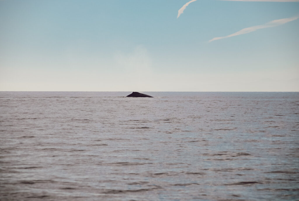 Und dann war es tatsächlich soweit, unser Tour Guide hatte in der Ferne Fontänen gesehen und machte sich mit unserem Boot auf den Weg etwas näher in deren Richtung zu fahren. Kurz darauf tauchte dann auch der erste Buckelwal direkt neben unserem Boot auf, doch dadurch, dass die Tiere immer nur eine kurze Zeit auftauchen, um Luft zu holen, dann wieder abtauchen und oft in andere Richtungen weiterschwimmen, hatten wir ihn nicht so nah erwartet… Zugegeben habe ich mich im ersten Moment sogar ziemlich erschrocken, denn auch wenn ich bereits einmal Whale Watching in Südafrika gemacht hatte, war das schon ein paar Jahre her und das Boot war damals deutlich größer.