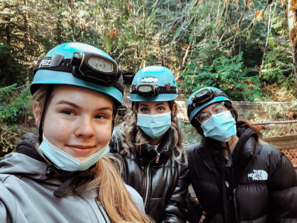 Nicht nur mit meiner Gastfamilie machte ich bereits viele Ausflüge, auch das Comox Valley International Student Program organisiert regelmäßige Trips mit zahlreichen Aktivitäten, darunter auch Cave Diving in den Horne Lake Caves gegen Ende Oktober. Die Preise dabei sind durch die hohe Personenanzahl oft etwas günstiger und ein weiterer Vorteil ist natürlich, dass man alles zusammen mit seinen Freunden erleben kann. Carolina, sie müsstet ihr ja schon von dem Artikel meiner Anreise kennen, und ihre mexikanische Gastschwester Alejandra waren auch dabei und sie werdet ihr auch auf dem folgenden Foto sehen.
